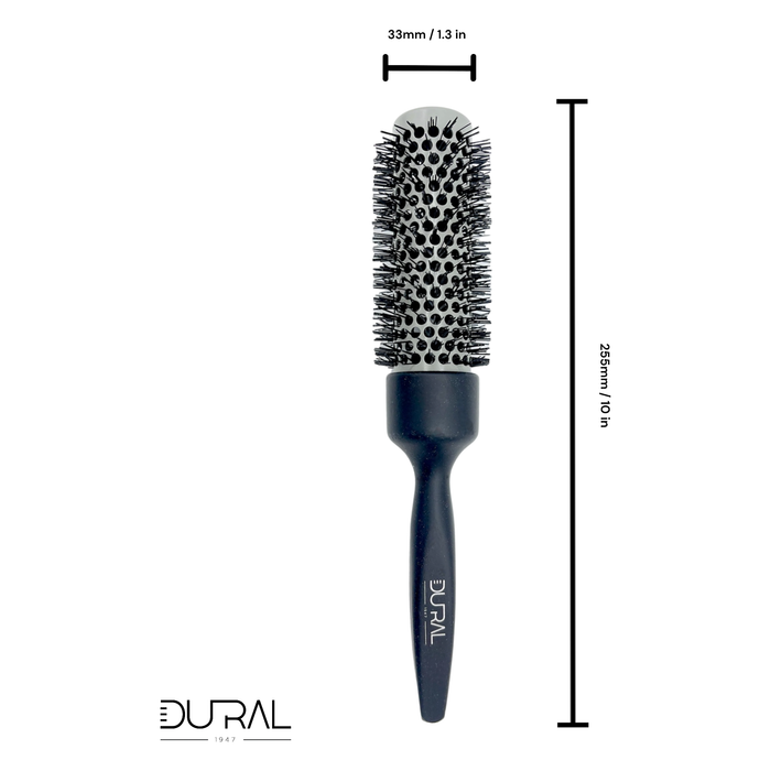 The Dural hair brush FlowStyler is a high-quality hair styling tool designed to help create a variety of hairstyles with ease. This brush features a tube diameter of 33mm, making it ideal for creating soft curls or waves in medium to long hair. The handle of the brush is made from wood, which not only provides a comfortable grip but also adds a touch of elegance to the overall design.