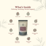 Organic Ingredients: Shepherd's Purse Leaf, Motherwort Leaf, Yarrow Flower, Nettle Leaf, Burdock Root, Red Raspberry Leaf, Ashwagandha Root, Peppermint Leaf, Citrus Peel, and Stevia Leaf