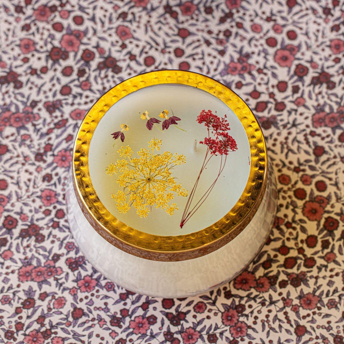 Pressed floral candles feature dreamy floral tableaus displayed between panes of glass. Hand poured with a coconut wax blend. Lovingly handmade in Colorado.